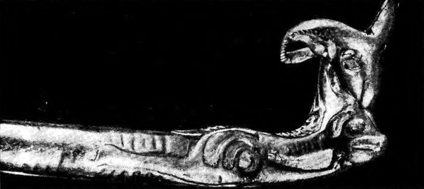 Не менее интересным оказались погребения поздних тюркоязычных кочевников. В исследованных могилах были погребены воины вместе с убитыми боевыми конями, положенными на земляные приступки несколько выше дна могилы головами па запад, как и воины. От конской сбруи сохранились железные удила с большими кольцами и стремена. При воинах лежали длинные железные мечи, берестяные колчаны с железными и костяными наконечниками стрел. В могилах найдены интересные поделки из кости — прекрасные образцы косторезного дела поздних кочевников: пряжки, навершье, вероятно, от ручки нагайки в виде дракона с чешуйчатым телом.