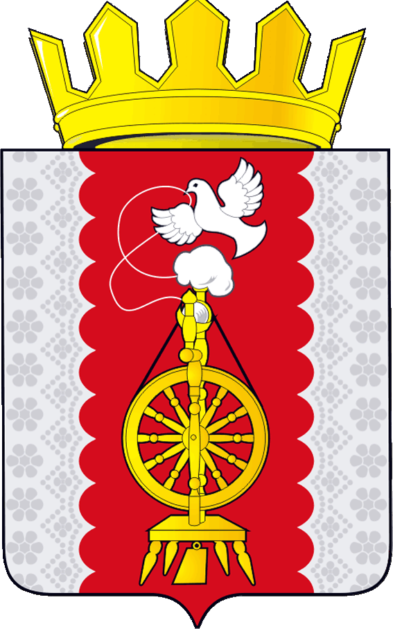 Описание: В красном поле желтая прялка, летящий серебряный голубь, имеющий в клюве серебряную нить, по бокам узор условно в виде ломанных линий и «шестицветников» (белым цветом). Щит увенчан муниципальной короной установленного образца.