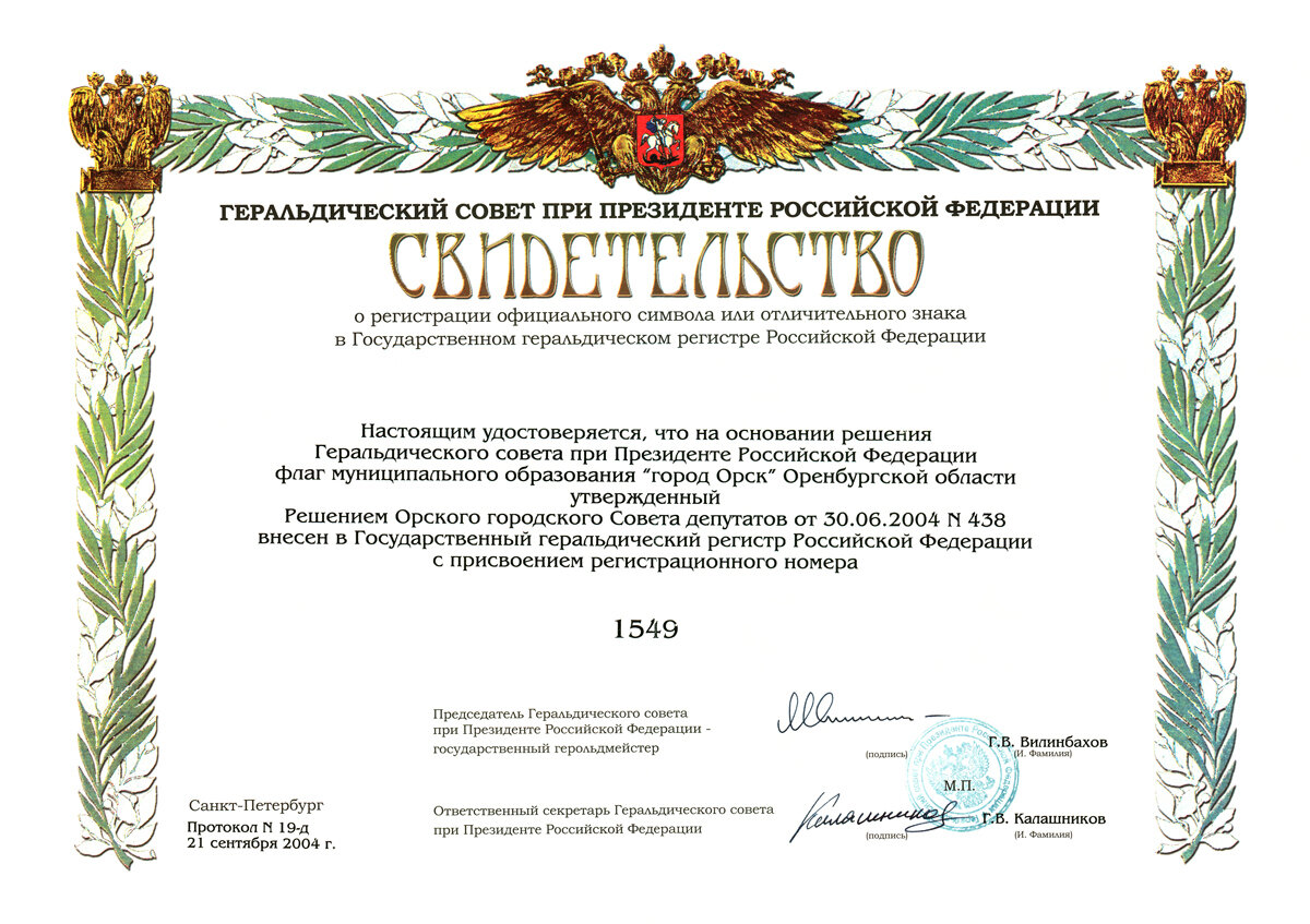 Свидетельство о внесении флага в Государственный геральдический регистр РФ