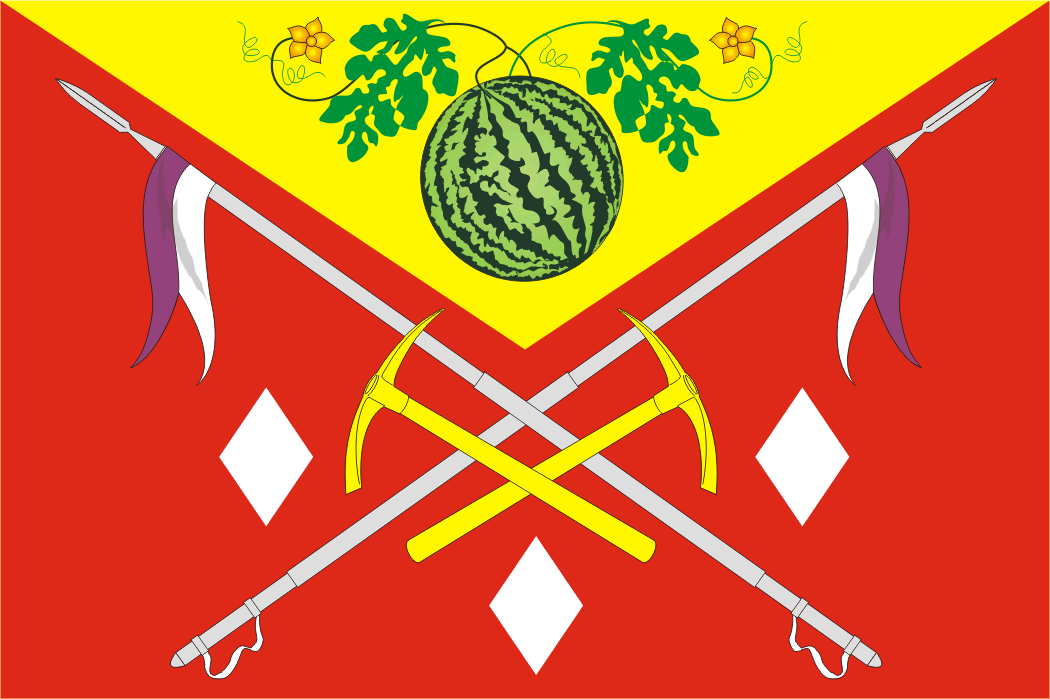 Описание: В червленом (красном) поле положенные накрест серебряные казачьи пики с пурпурно-серебряными значками о двух косицах каждая, поверх них также накрест положены две золотые кирки, все сопровождается по сторонам и снизу тремя серебряными веретенами, в треугольной золотой главе арбуз натуральных тинктур с двумя зелеными листьями и двумя цветками натуральных тинктур.