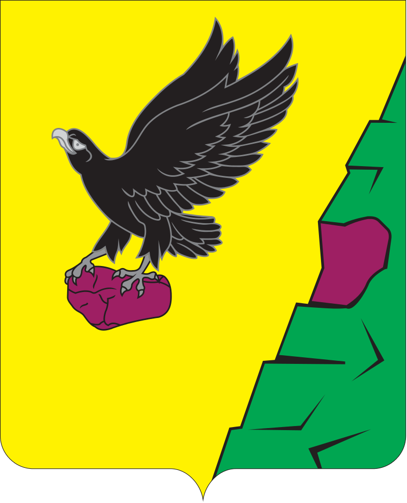 Описание: В золотом поле, с выходящей слева зелёной скалой, посередине склона имеющей пурпурную выемку, летящий вправо с воздетыми крыльями чёрный коршун, вооружённый серебром и несущий в лапах пурпурный камень.