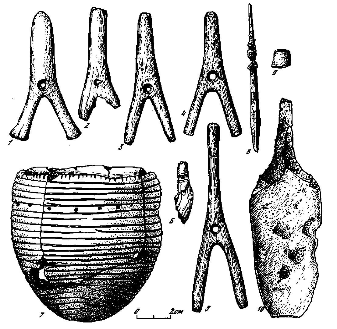 1-5 — кость; 6 — зуб животного; 7 — глина; 8-10 — бронза