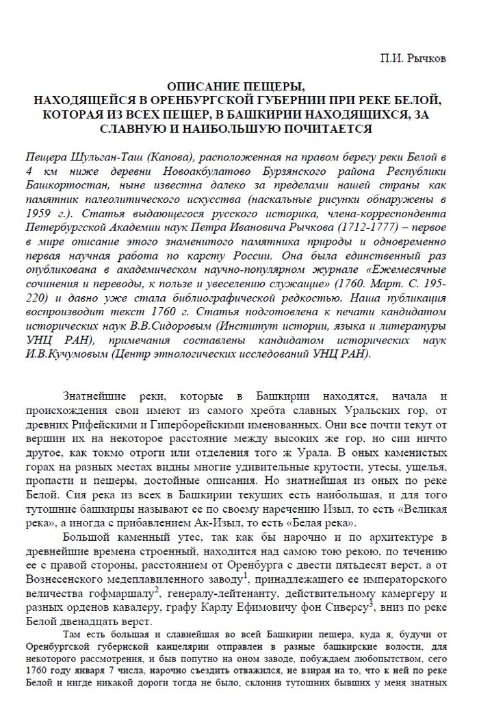 Пещера Шульган-Таш (Капова), расположенная на правом берегу реки Белой в 4 км ниже деревни Новоакбулатово Бурзянского района Республики Башкортостан, ныне известна далеко за пределами нашей страны как памятник палеолитического искусства (наскальные рисунки обнаружены в 1959 г.). Статья выдающегося русского историка, члена-корреспондента Петербургской Академии наук Петра Ивановича Рычкова (1712–1777) — первое в мире описание этого знаменитого памятника природы и одновременно первая научная работа по карсту России.