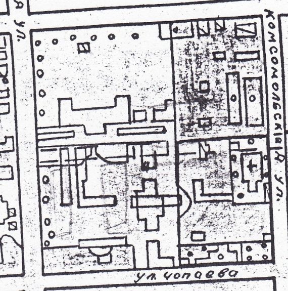 Выкопировка из Генплана Бузулука 1960 года. Крестом обозначена Петропавловская церковь