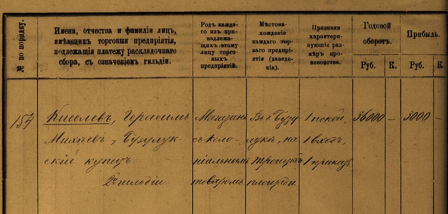 Запись о налогах с оборота купца Герасима Киселева