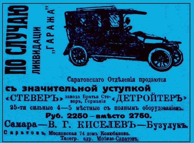 С 1910 по 1912 Василий Герасимович Киселев в Самаре занимался продажей автомобилей. поставками дизельных моторов, локомобилей и другой сельскохозяйственной техники американского и австро-венгерского производств, аппаратов керосинно-калильного освещения.