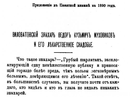 А в продолжение темы - статья из адрес-календаря Самарской губернии на 1890 год, рассказывающая о широко известном в свое время знахаре, уроженце Бузулукского уезда Федоре Муховникове.