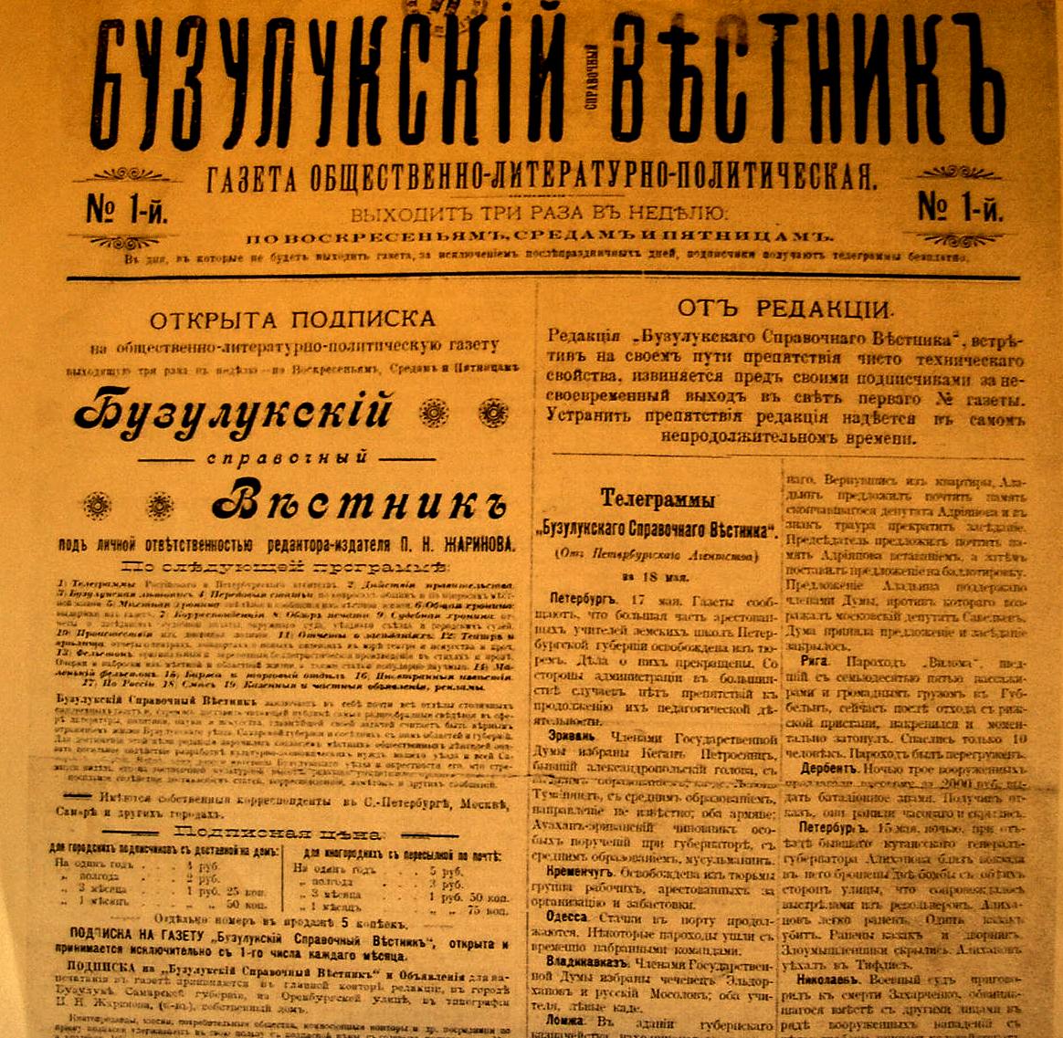В первом номере газеты было напечатано следующее обращение к читателям: «Редакция Бузулукского справочного вестника», встретив на своем пути препятствия чисто технического свойства, извиняется перед своими подписчиками за несвоевременный выход в свет первого номера газеты. Устранить препятствия редакция надеется в самом непродолжительном времени». И ниже: «В типографию требуются опытные и трезвые наборщики».