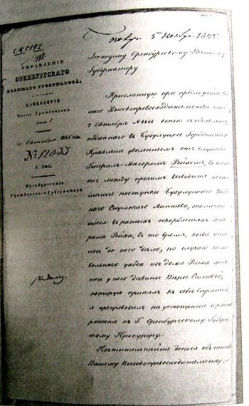 Присланную по предложению Вашего Высокопревосходительства копию от 7 октября № 4446 с объявления, поданного в Бузулукское Городническое правление уволенным от службы генерал-майором Рейхом, в коем он, между прочим, выводит неприличные поступки Бузулукского уездного стряпчего Лаптева, заключающиеся в разных оскорблениях генерала Рейха, в то время, когда имелось до него дело, по случаю самовольного ухода из дома Райха дворовой девки Веры Есиповой, которую принял к себе стряпчий, я препроводил на усмотрение и распоряжение господину Губернскому Прокурору, поскольку Бузулукский городничий в этом деле принял сторону стряпчего.
