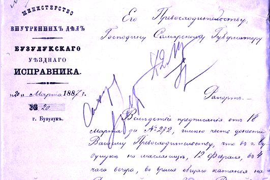 20 марта 1887 года Бузулукский уездный исправник Мартов отправил Самарскому губернатору рапорт о значительных случаях нарушения общественного порядка в городе Бузулуке в 1887 году: