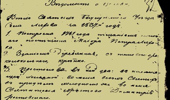 В 1761 году Петр Ляхов построил церковь. Здание церкви было деревянным с колокольней. Престолов в этой церкви было два - один во имя Всех святых и второй во имя Святителя Христова Дмитрия Ростовского.