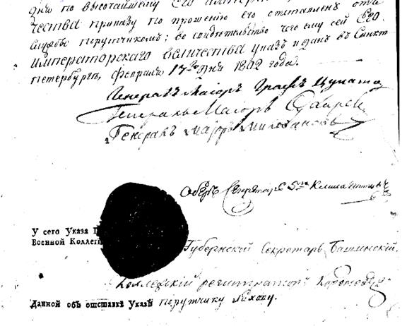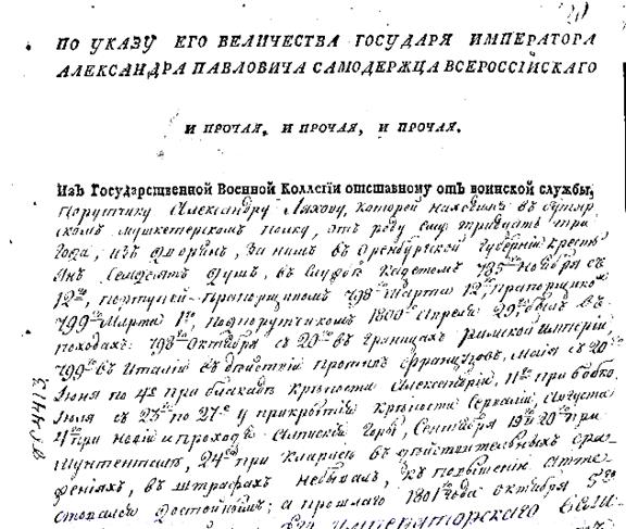 В указе императора Александра Павловича о дозволении отставки от воинской службы было записано: «Поручику Александру Ляхову, который находился в Бутырском мушкетерском полку, от роду тридцать три года. За ним в Оренбургской губернии крестьян семдесят душ. В службе он (состоял) кадетом в 1785 году, портупей-прапорщиком в 1798 году, прапорщиком в 1799 году подпоручиком в 1800 году. Был в походах: с 20 октября 1798 года в границах Римской империи, с 1799 в Италии принимал участие в действиях против французов. С мая по июнь 1799 года принимал участие в блокаде крепости Александрия, 11 июня в битве под Бобко, с 23 по 27 июня в битве у крепости Сервами, 4 августа при Нови и переходе через Альпийские горы, 19 и 20 сентября принимал участие в сражение у Мунтентешле, 24 сентября у Кларисте. В штрафах не был, к повышениям аттестован достойным, а 5 октября прошлого 1801 года по Высочайшему Его Императорского Величества указу по прошению его отставлен от службы поручиком. Со свидетельством чего сей указ от 17 февраля 1802 года».