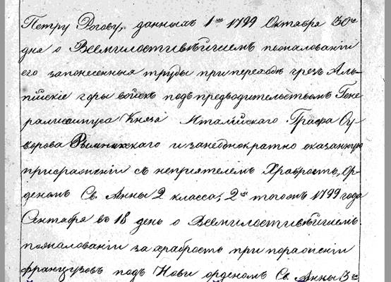 Близкий друг отца Александра Петровича майор Петр Ерофеевич Рогов также был участником суворовского перехода через Альпы и был награжден орденом Святой Анны 3 степени за храбрость, проявленную в битве при Нови.