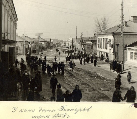 Фото 1958 года, как написано на бумажной подложке. Время суток 12 ч., полдень, по-видимому март-апрель. Это видно на часах справа, на столбе возле 2-х этажного здания. Слева заметны открытые двери кинотеатра «Пионер» и ныне разрушенные ступени у выхода. Территориально это угол улиц Чернореченской («уходит» вниз от места съемки) и Пионерской (бывш. Кривцовская), вид в сторону от центра, к реке Урал. Ранее эти места назывались Старой слободкой, или «Голубиной», по хаотичности расположенных в ней домов, как гнезда голубей, в изобилии водившихся там.