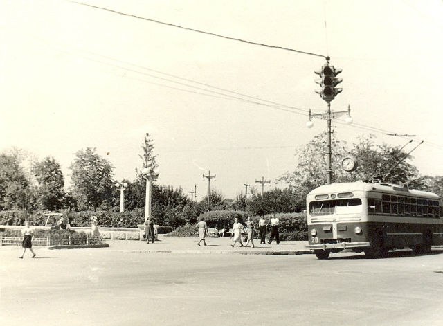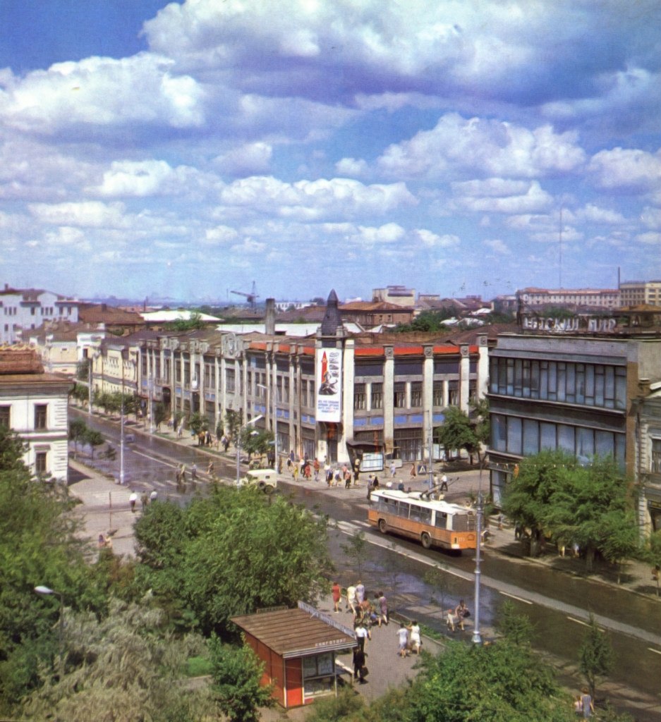 Фото 1960-70-х годов, угол улиц Володарской (бывш. Инженерной) и Советской (бывш. Большая, Николаевская) в сторону парка у фонтана. На часах 13-30 ч., июнь-июль. Троллейбус МТБ-82 №20 движется, видимо, по маршруту №2, на набережную реки Урал. Кстати, старое название Урала – Яик (Джаик, что правильнее), а в греческих переводах – Ликос (!) и даже Рифей (!). Примерную дату фотосъемки можно определить по высоте деревьев, высаженных вдоль ограды после сноса Казанского собора в 1932 г.