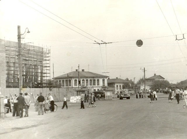 Редкое фото, необычный ракурс со стороны ул.8-ое Марта (бывш. участок Конно-Сенной площади) к ул. Постникова (бывш. Суринская). Слева – в строительных лесах здание Театра Музыкальной комедии, следовательно, фото сделано до 1963 г. В центре 2-х этажное здание (построено в начале 20-го века) Оренбургской областной библиотеки. На фото видно, что не было ни разметки, переходов…автомобилей было ЗНАЧИТЕЛЬНО меньше, если не сказать мало. Личного транспорта, как велосипед, лошадей и мотоциклов (трофейных!), на улицах города ездило настолько мало, что дети спокойно играли на дороге. Начиналось время популярности мопедов и мотороллеров. На фото, у будки, автомобиль ЗИЛ-164 или ЗИЛ-150(?).