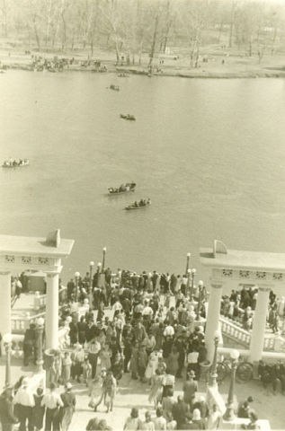 Фото примерно 1960-х годов. Время съемки примерно конец апреля-май. Обычная ежегодная картина разлива реки Урал и затопление Зауральной рощи (бывш. название Городская роща) до 1980-х годов, когда степень разлива уменьшилась. В 1974 году Урал разлился так, что затопил по конек крыш дома Кузнечного поселка. Люди спасались в лодках и сидели на крышах. В спасении людей принимали участия войска и боевая плавающая техника.