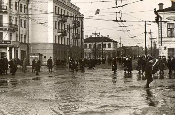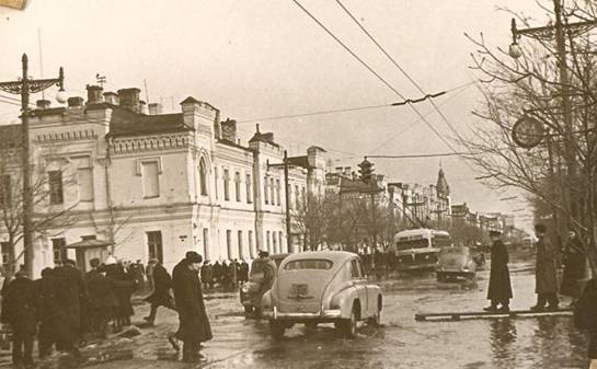 Слева на фото здание в два этажа (бывш. Инженерная команда), вдоль улицы Володарского (бывш. Инженерная), слева-направо проходит улица Советская (бывш. Николаевская). Почему много людей на улице? Возвращаются все с работы, а в автомобилях «Победа» едут домой начальники, ул. Советская была тогда не прогулочной зоной, а обычной проезжей дорогой.