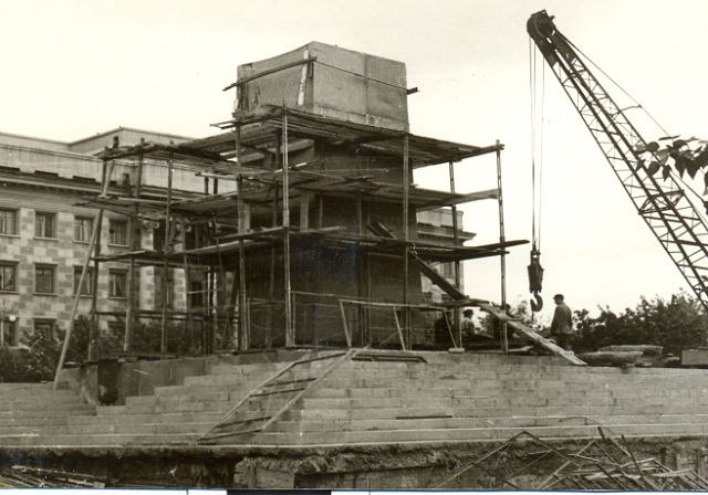 Установка постамента памятника В.И. Ленину (Ульянову), фото примерно 1962-63 гг. Автор памятника скульптор В.Б. Пинчук (очень известный и популярный), архитектор (А.И. Лапиров).