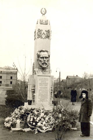 Памятник П.А. Кобозеву. Невозможно с уверенностью определить, где располагался ЭТОТ памятник и в Оренбурге ли сделан этот снимок. На углу улиц Кобозева (бывш. Троицкая? по церкви Троицы) и Постникова (бывш. Суринская) памятник установлен в 1957 году.