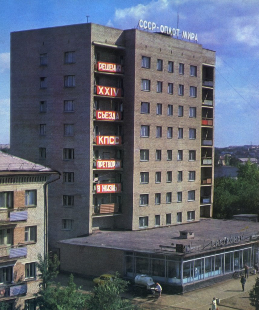 Фото 1971 года. 9-ти этажное здание на проспекте Победы с «Гастрономом». Слева от здания бочка с квасом, 1 литр - 12 коп., стакан кваса – 3 копейки.