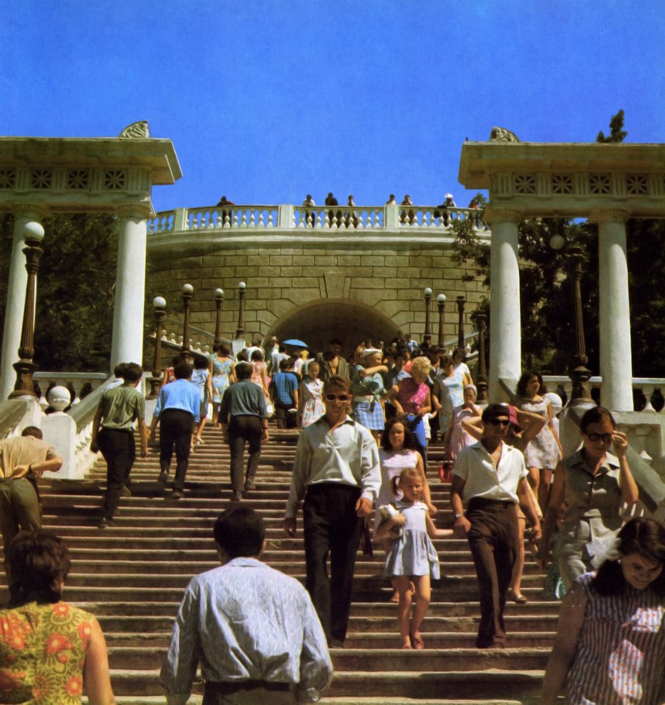 Известное, узнаваемое место в Оренбурге. Спуск к реке Урал. Фото середины 1970-х годов. Раньше спуск находился в другом месте. Если смотреть на р. Урал с набережной – то слева. В народе имел название «Змеиный», по извилистому направлению дорожки на крутом берегу. Сейчас этот спуск восстановлен и начинается от реконструированных «Екатериненских» (они же «Водяные») ворот на набережной. Напротив этих ворот находится здание бывших конюшен, в которых в советское время располагались мастерские троллейбусного парка.