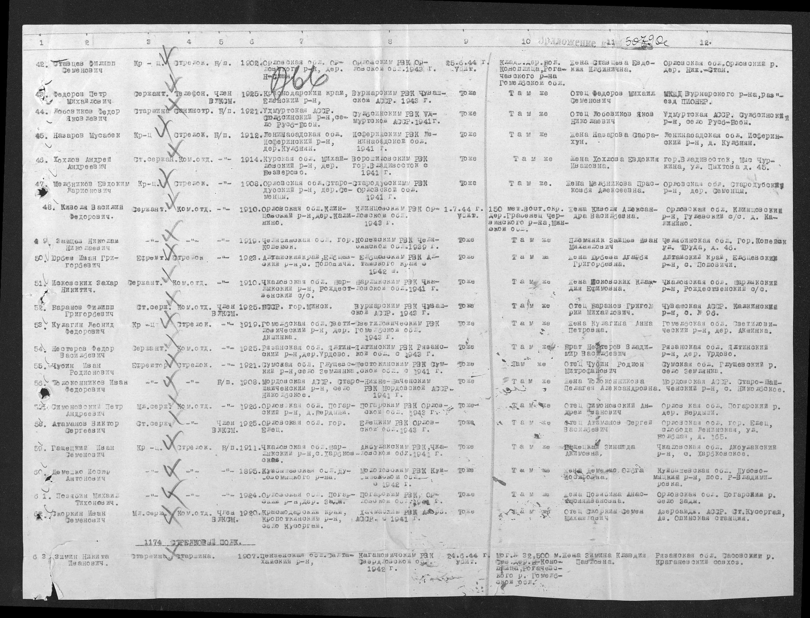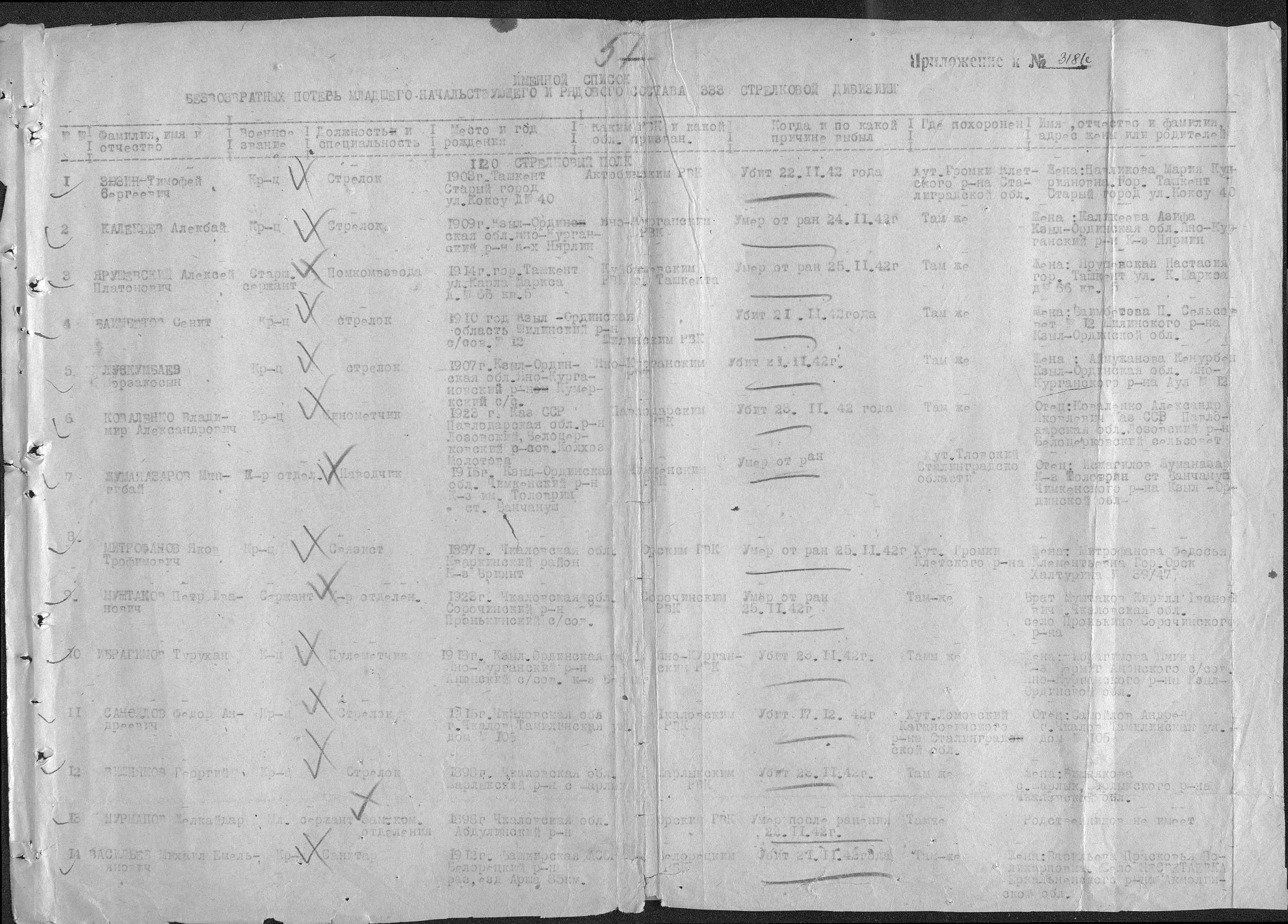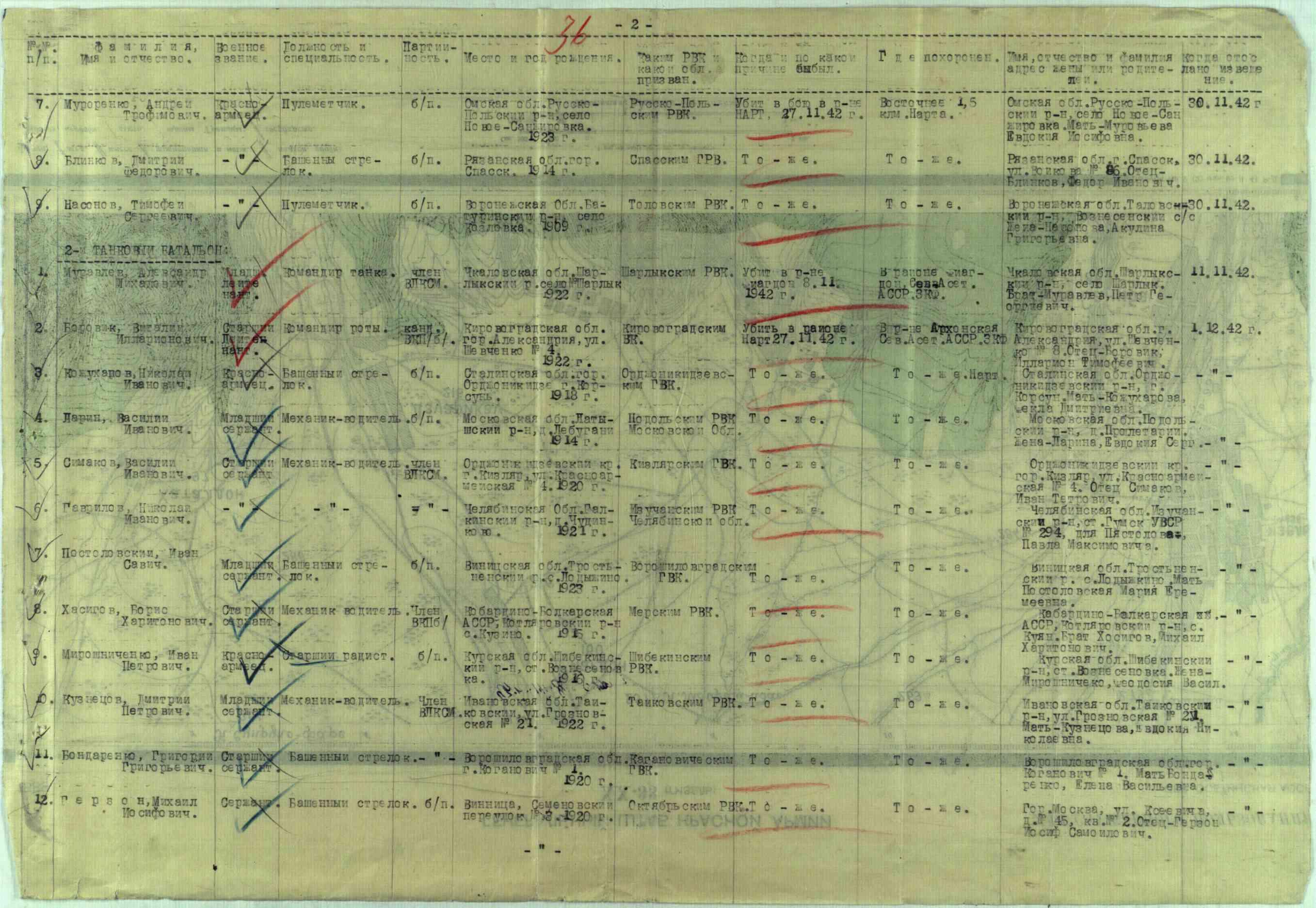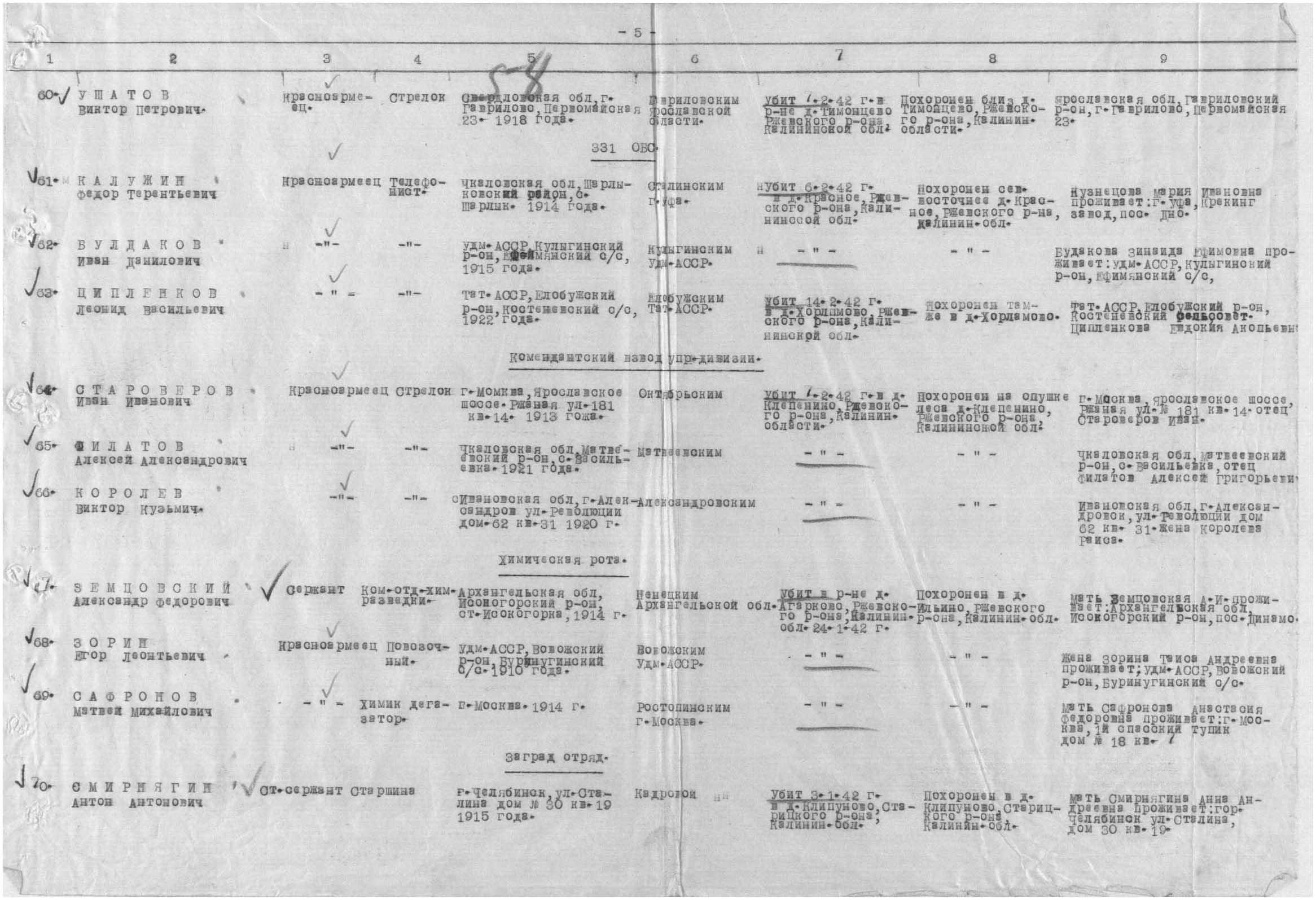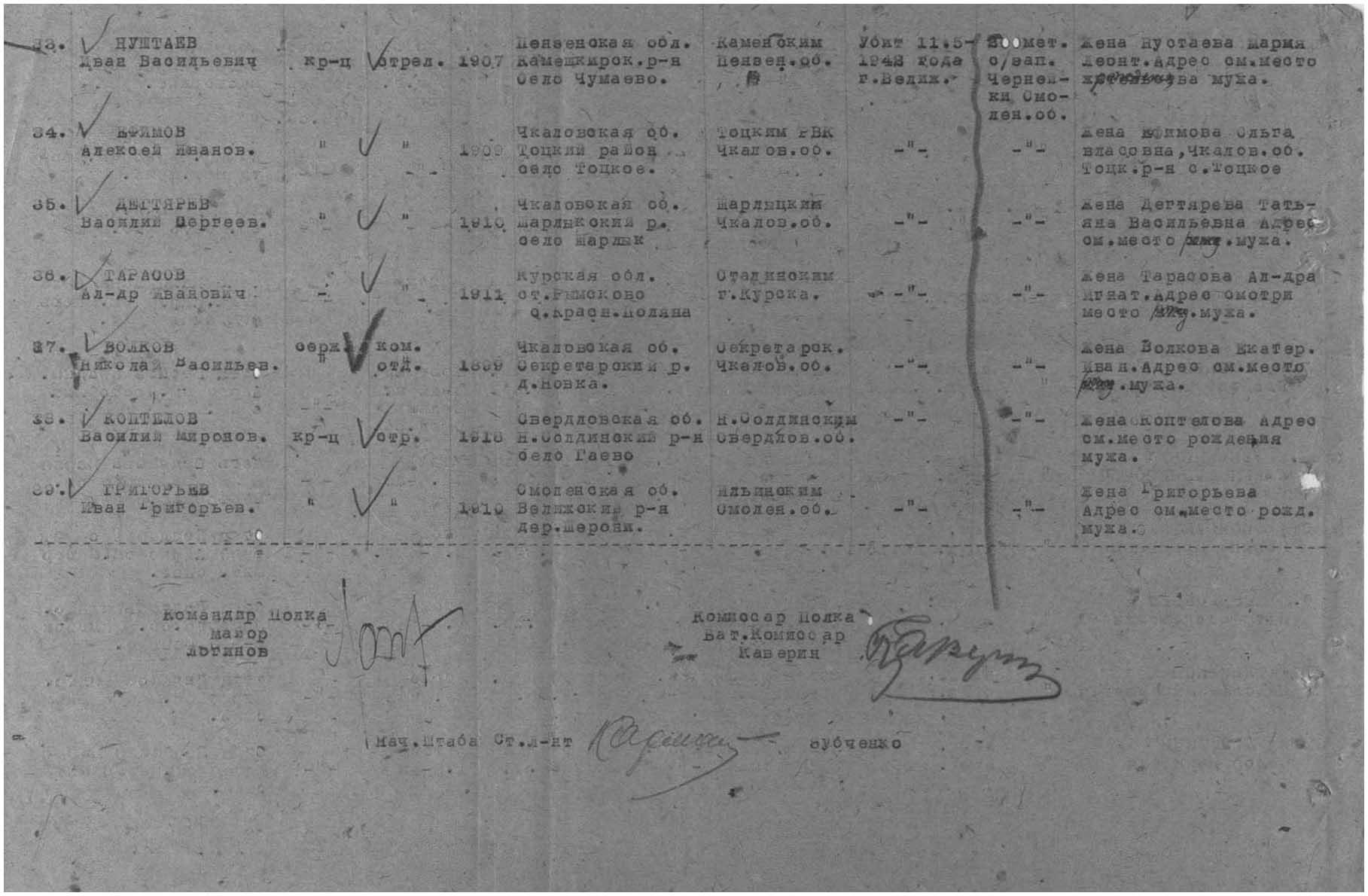 - МУРАВЛЕВ ДМИТРИЙ АЛЕКСЕЕВИЧ, 1903 г.р., родился с.Шарлык Оренбургской области, призван Кугорганским РВК 6 января 1942 г., беспартийный, рядовой 1-го батальона 375 СП 219 СД, осужден военным трибуналом 219 СД на 10 лет лишения свободы с поражением в правах на 5 лет в декабре 1942 г. (ЦАМО Ф.58 ОП.18001 Д.510)