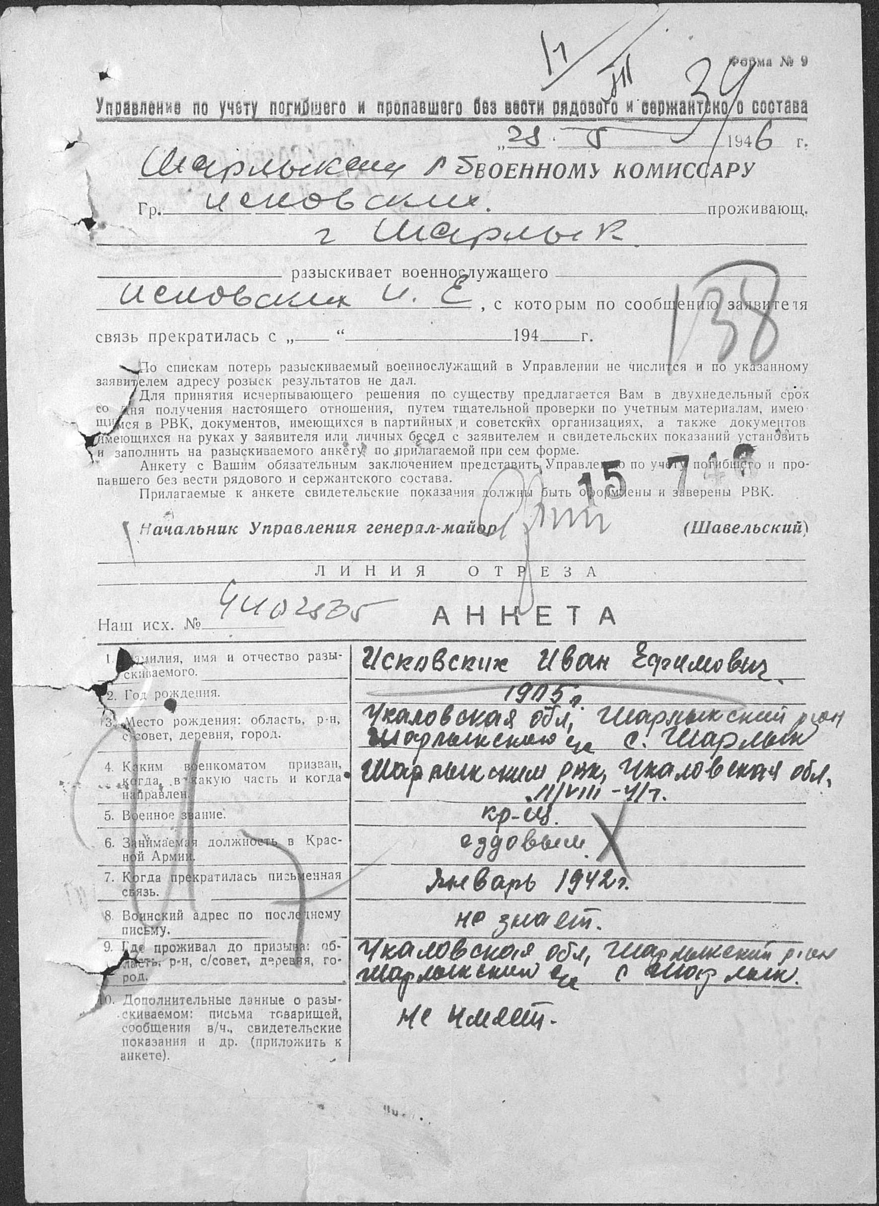 - ИВАНОВ АЛЕКСЕЙ АНДРЕЕВИЧ, 1897 г., родился с.Шарлык Оренбургской области, призван Хобуанским РВК, красноармеец 306 стрелкового полка, полевая почта 771, пропал без вести 01 августа 1942 г. (ЦАМО Ф.58 ОП.18002 Д.1046)