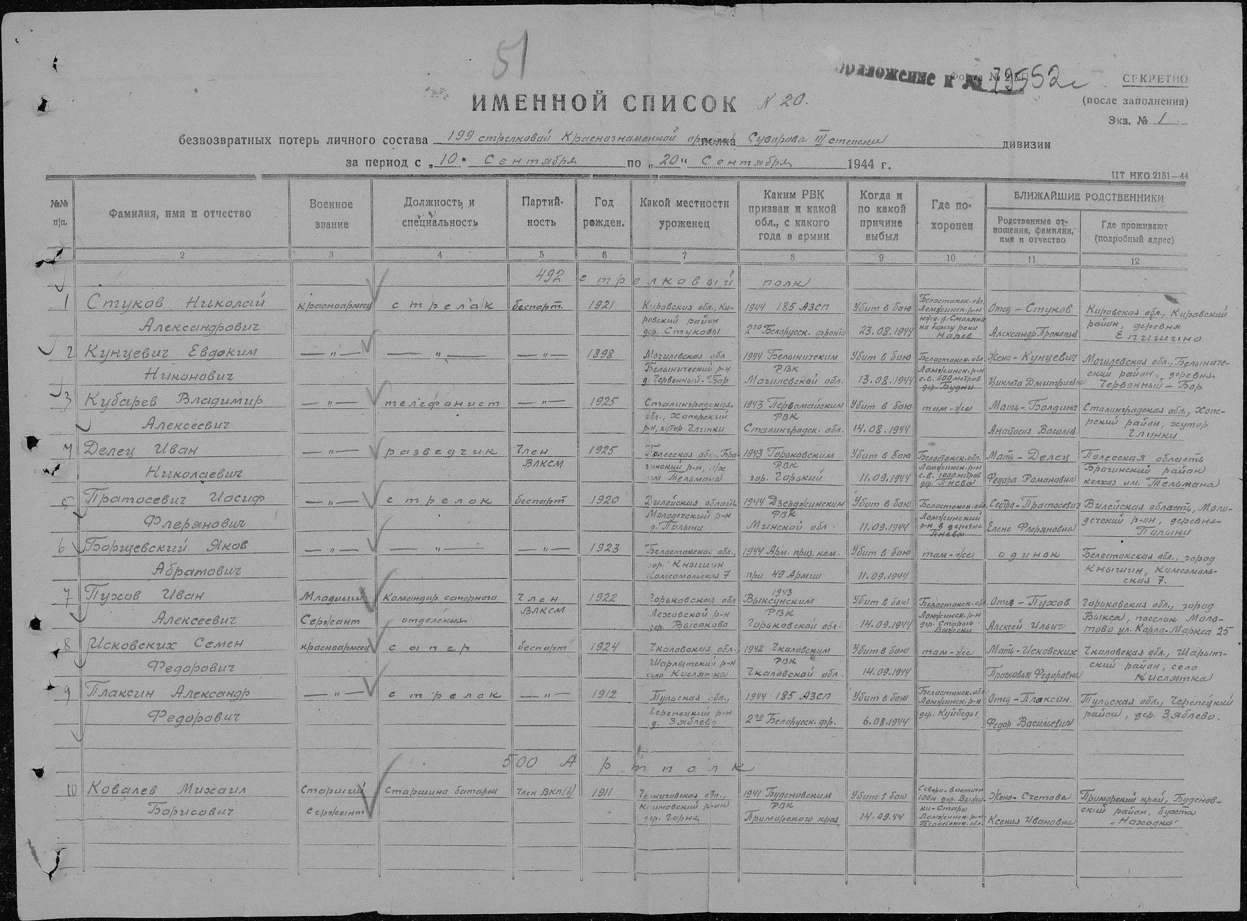 - ДЕГТЕРЕВ ИВАН НИКИТОВИЧ, 1910 г.р., родился с.Шарлык Оренбургской области, красноармеец 415 СД, попал без вести 20 марта 1942 г. в районе д.березки Лезноковского района Смоленской области. (ЦАМО Ф.58 ОП.818883 Д.895)