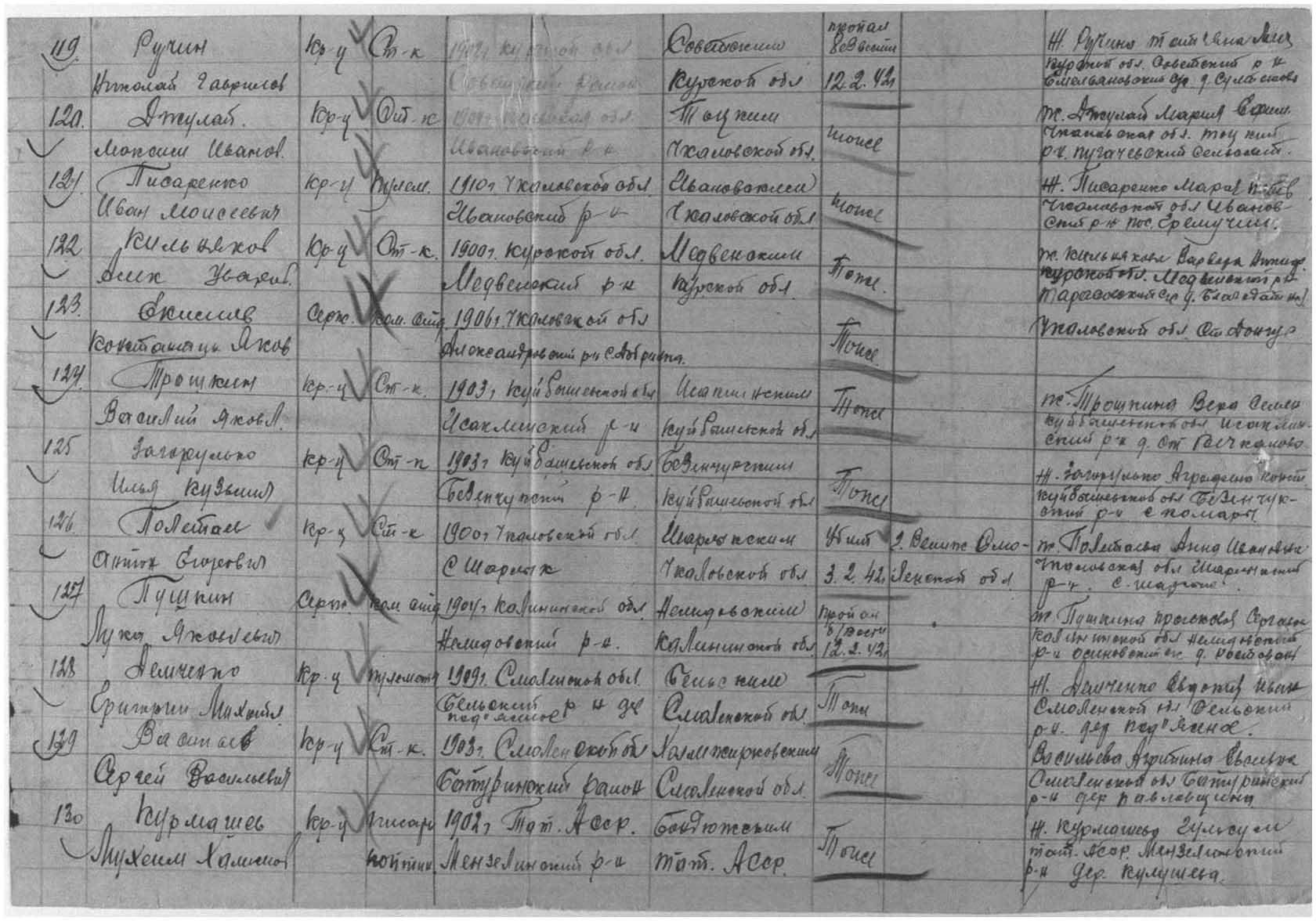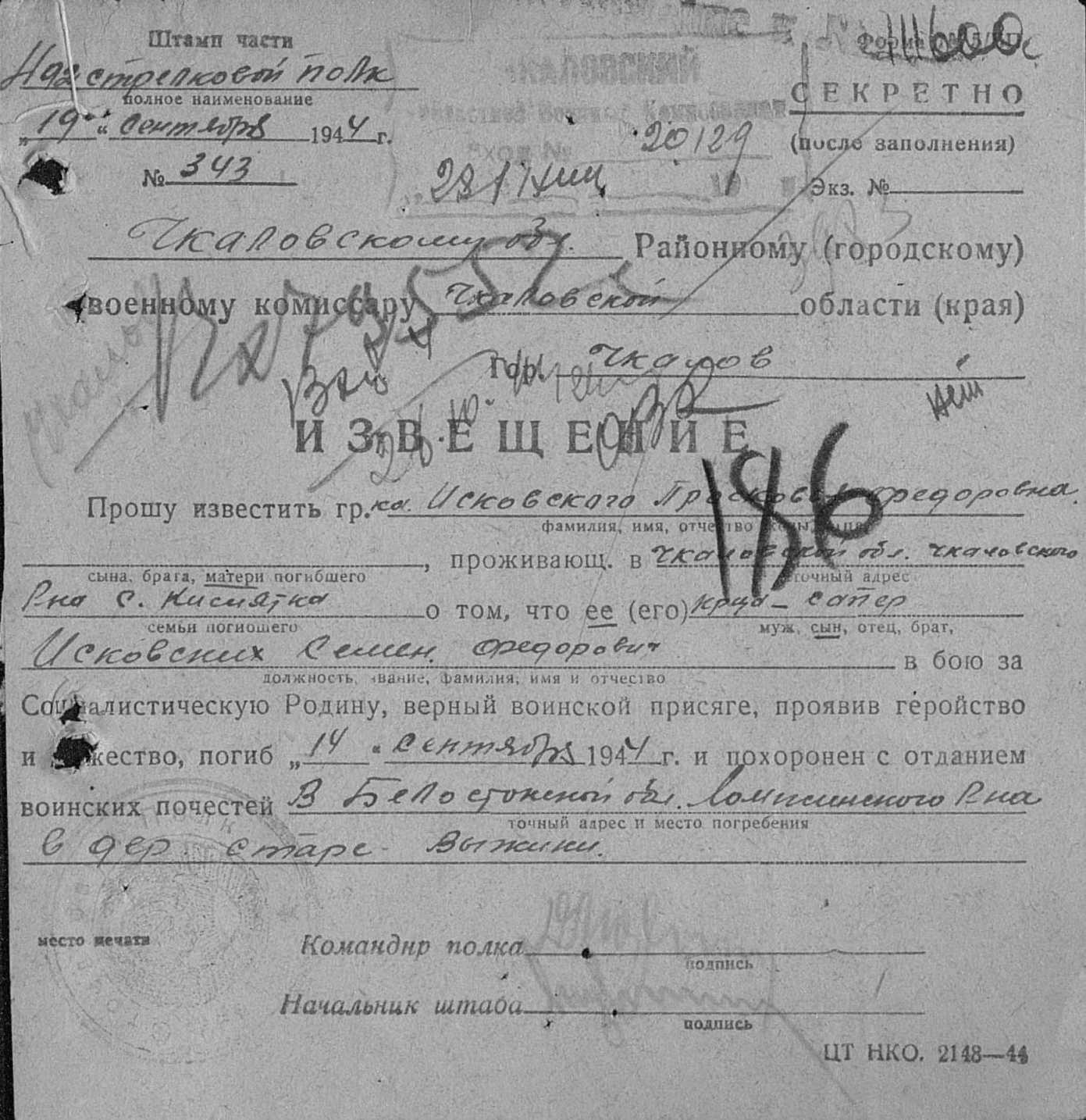 - ИСКОВСКИХ ПАВЕЛ МИХАЙЛОВИЧ, 1918 г., родился с.Шарлык Оренбургской области, образование 7 классов получил в Шарлыкской школе №2, работал в колхозе трактористом, призван Шарлыкским РВК в сентябре 1939 г. в РККА, гвардии сержант 93 Гвардейской стрелковой дивизии 108 отдельного саперного батальона, беспартийный, по донесениям штаба дивизии - пропал без вести 15 июля 1943 г. в Сажновском районе Курской области. (ЦАМО Ф.58 ОП.18001 Д.793). По уточненным сведениям – в указанный период попал в плен в районе г.Белграда, когда армейская часть находилась в окружении. Находился в лагере для военнопленных в селе Янковка 3 недели. Выполнял земляные работы на строительстве оборонительных сооружений г.Черкассы. В немецком рабочем батальоне находился с августа 1943 г. по февраль 1944г., когда был освобожден из плена при разгроме окружной немецкой группировки под г.Корсунь. После освобождения из плена 3 апреля 1944 г. направлен в санчасть №3007 г.Белая Церковь. По выздоровлении переведен в проверочно-фильтрационный лагерь, где было заведено дело по проверке показаний военнопленного. По окончании ВОВ вернулся в родное село, затем переехал на жительство в совхоз им.Ленина Оренбургского района. (ЦДНИ Оренбургской области, Ф.8003 ОП.1 Д.6757)
