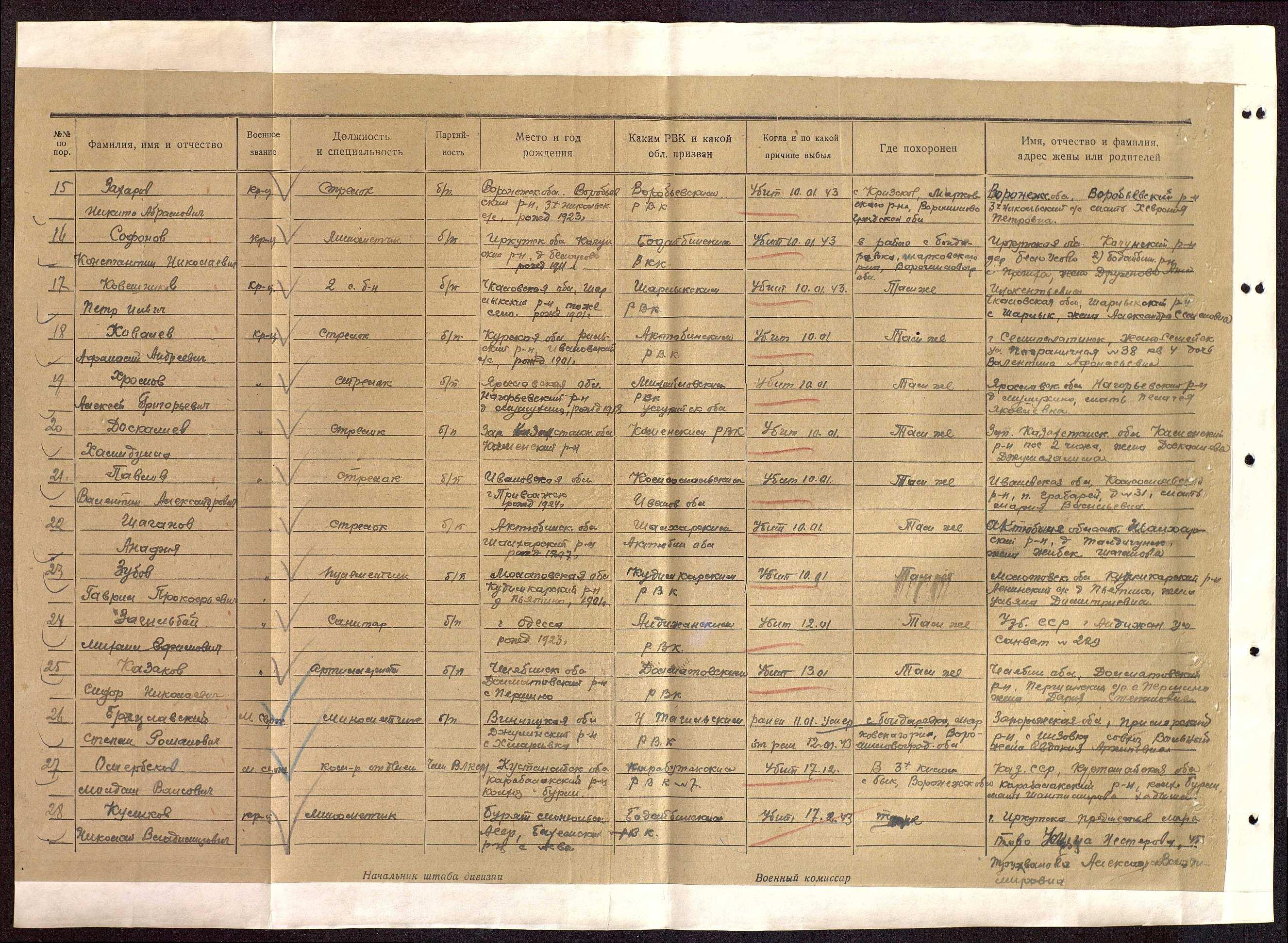 - МЕРЗЛИКИН ВАСИЛИЙ СЕРГЕЕВИЧ, 1914 г.р., родился с.Шарлык Оренбургской области, проживал с.Шарлык ул.Калининская д.118, сержант 637 АП, телеграфист, пленен 17 августа 1941 г. умер в плену 21 июня 1942 г., , лагерь STALAG XX (312), Мариенбург. Похоронен там же.