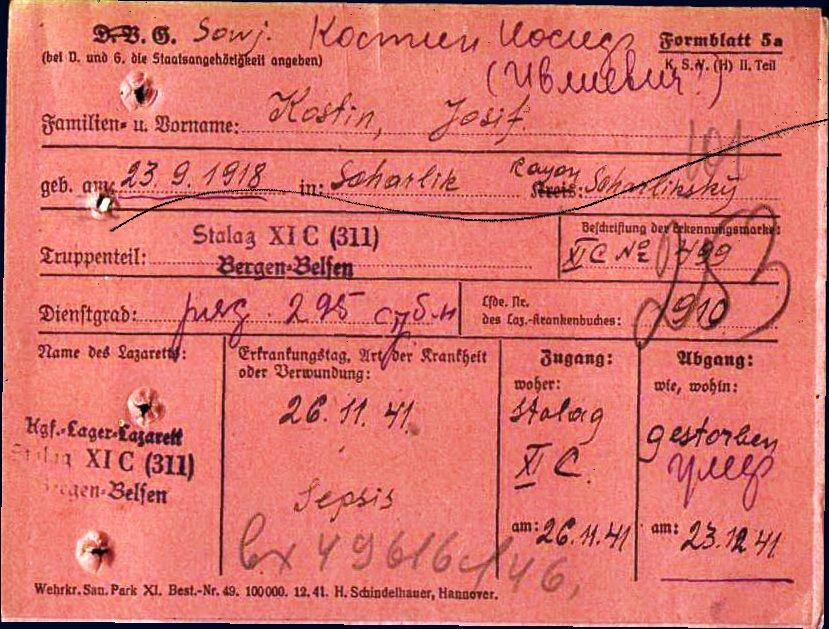 - КОСТИН НИКОЛАЙ ПЕТРОВИЧ, 1911 г.р., родился с.Шарлык Оренбургской области, беспартийный, женат, в 1936-37 гг. выехал на учебу в г.Москва, в 1941 г. эвакуирован в г.Уфа, где проживал на ул.Красина д.52 д.2, призван Уфимским ГВК на фронт в 1942 г., младший лейтенант 39 Танковой Чаплинской Краснознаменной ордена Б.Хмельницкого бригады, командир танка 3-го танкового батальона, беспартийный, убит в бою 11 апреля 1945 г., похоронен 500 м. восточнее н\п Герасдорф, Австрия. (ЦАМО Ф.33 Д.11458 Д.849)