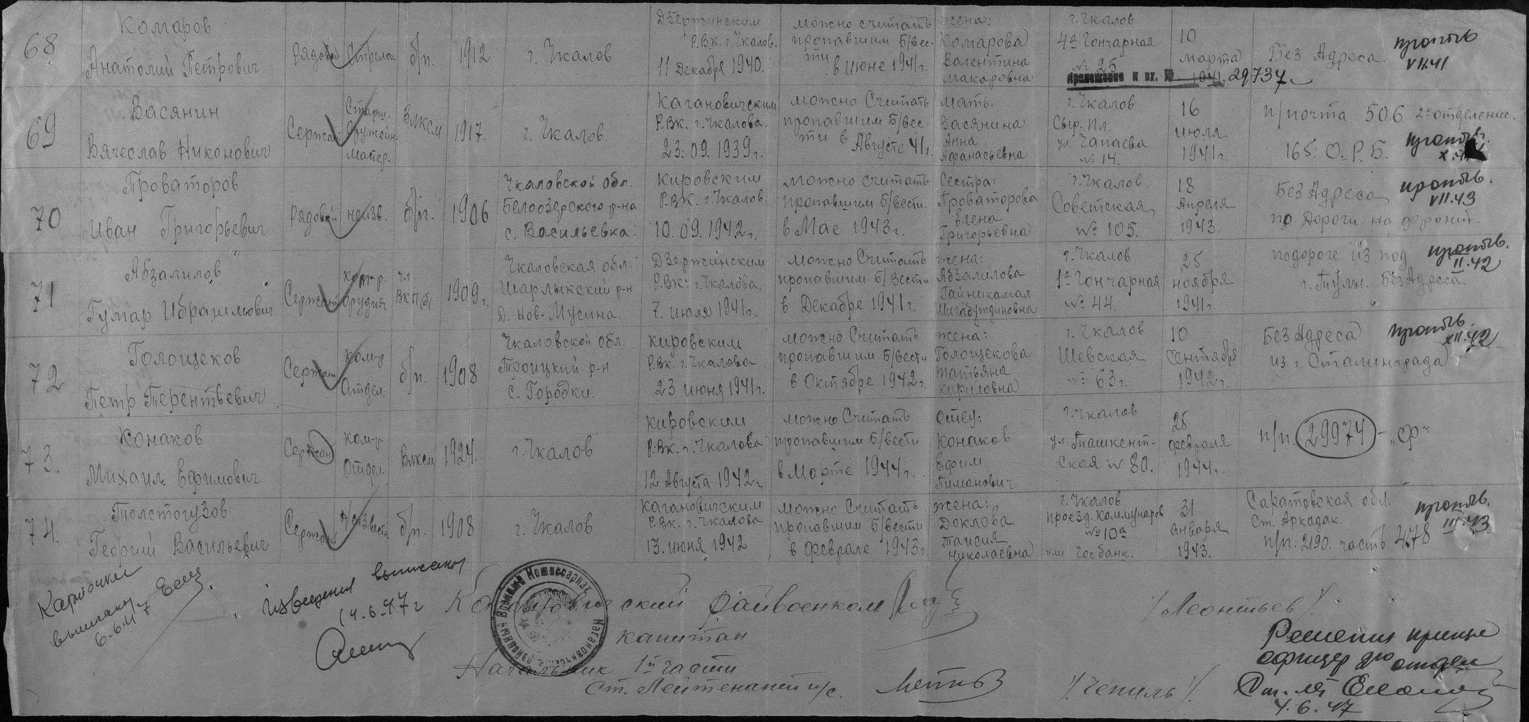 - КАЛУЖИН ИВАН МИХАЙЛОВИЧ, 1913 г.р., родился с.Шарлык Оренбургской области, призван Кировским РВК г.Чкалов, проживал пер.Матросский д.6, красноармеец ППС 1613, по сведениям 4-го отделения ЦУП с 30 ноября 1941 г. от него нет известий, с января 1942 г. считается пропавшим без вести. (ЦАМО Ф.58 ОП.18002 Д.637)