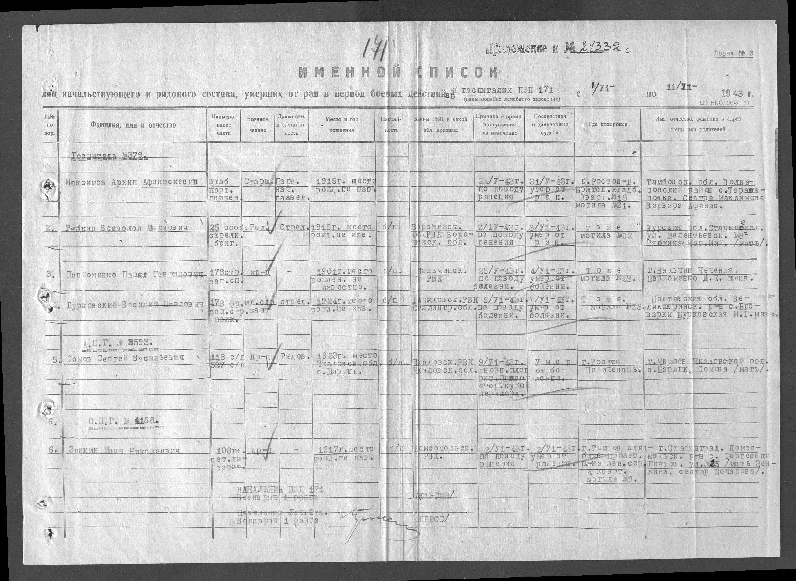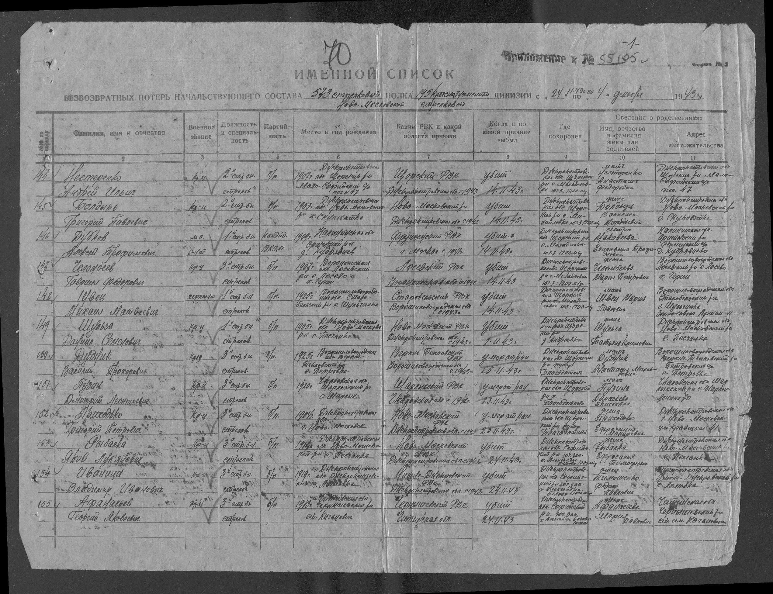 ГИРИН НИКОЛАЙ ИЛЛАРИОНОВИЧ - по словам внучки (Яковенко Елены Павловны) её дед не погиб, как это указано в архиве, а вернулся с войны в 1945 году. В августе 1943 года он был тяжело ранен, но не убит. В 1943 году Гирин был стрелком 1193 стрелкового полка. И на тот момент у него была жена и трое детей.