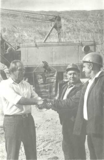 Секретарь парткома открытого рудника А.К. Петухов поздравляет победителей соревнования машинистов экскаватора кавалеров ордена Ленина Н.А. Никонца и ордена Трудового Красного Знамени Н.Т. Глазатова.