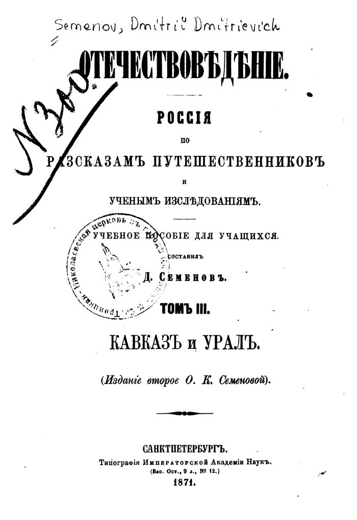 Санктпетербург. Типография Императорской Академии Наук. (Вас. Ост. 9 л., № 12.) 1871.