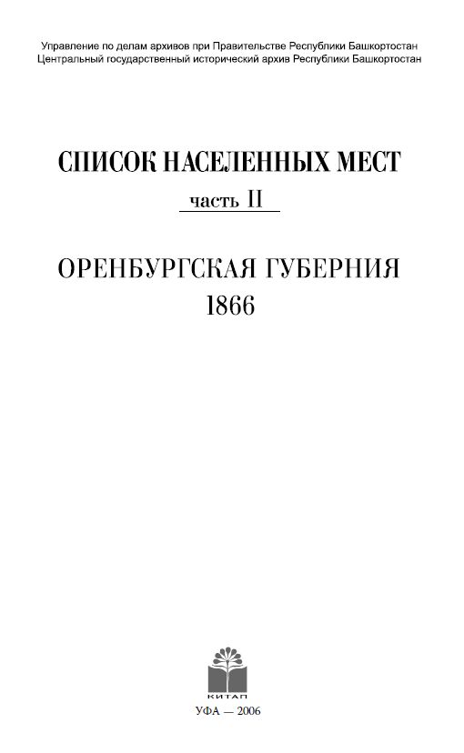 Данная книга является переизданием справочника «Оренбургская губерния. Список населенных мест по сведениям 1866 года. С.Пб., 1871».