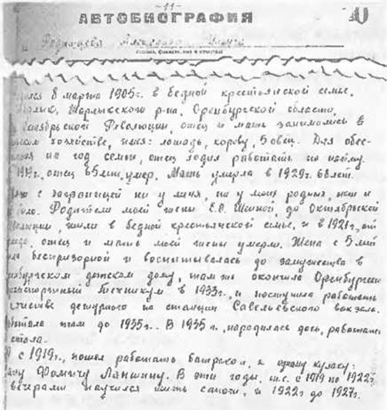 «Родипся 8 марта 1905 года в бедной крестьянской семье, с Шарлык Шарлыкского района Оренбургской области. До Октябрьской революции мать и отец занимались в сельском хозяйстве, имея: лошадь, корову, 5 овец. Для обеспечения на год семьи отец ходил работать по найму».