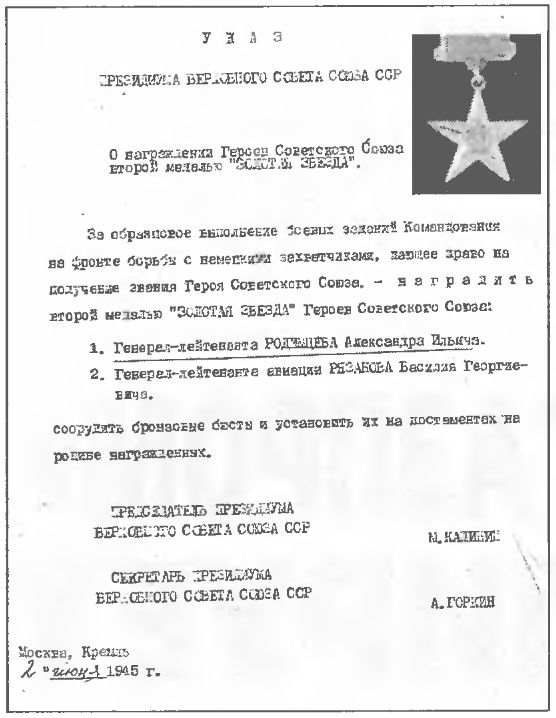 Но вот, наконец, долгожданный наградной лист от 24 февраля 1945 года, подписанный тоже Жадовым. Перечисление всех военных подвигов Родимцева и вывод: