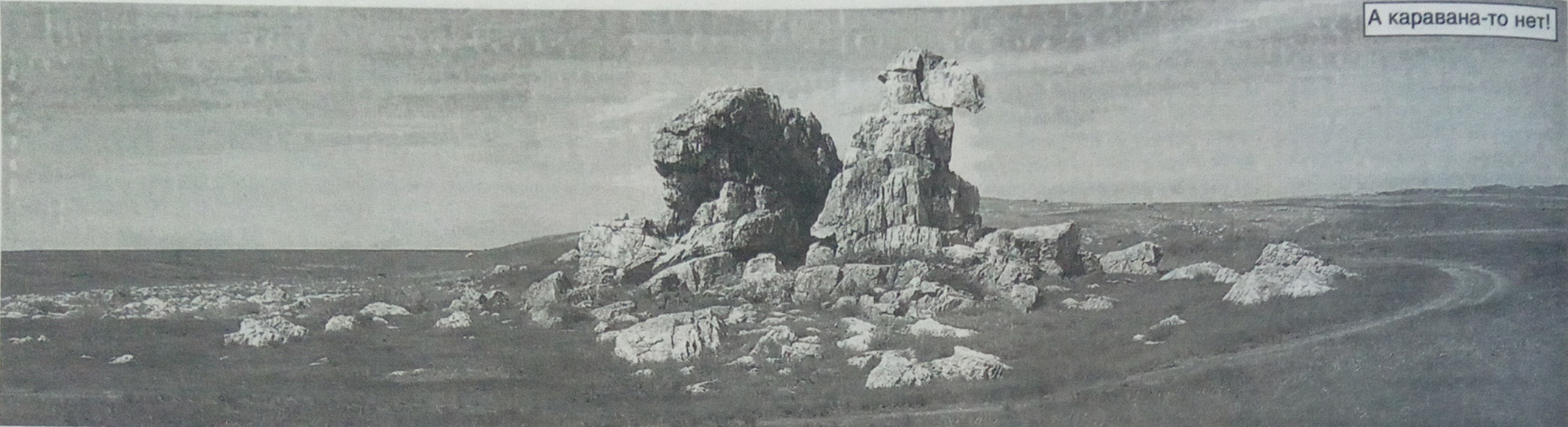 Объехали скалы кругом и увидели верблюда, только-только прилегшего отдохнуть после долгого караванного пути. Двадцатиметровая высота как-то не бросалась в глаза на просторной равнине. Верблюд смотрел на восток, в сторону Казахстана, до которого оставалась пара километров. Более восточной точки в нашей области, пожалуй, и не отыщешь.