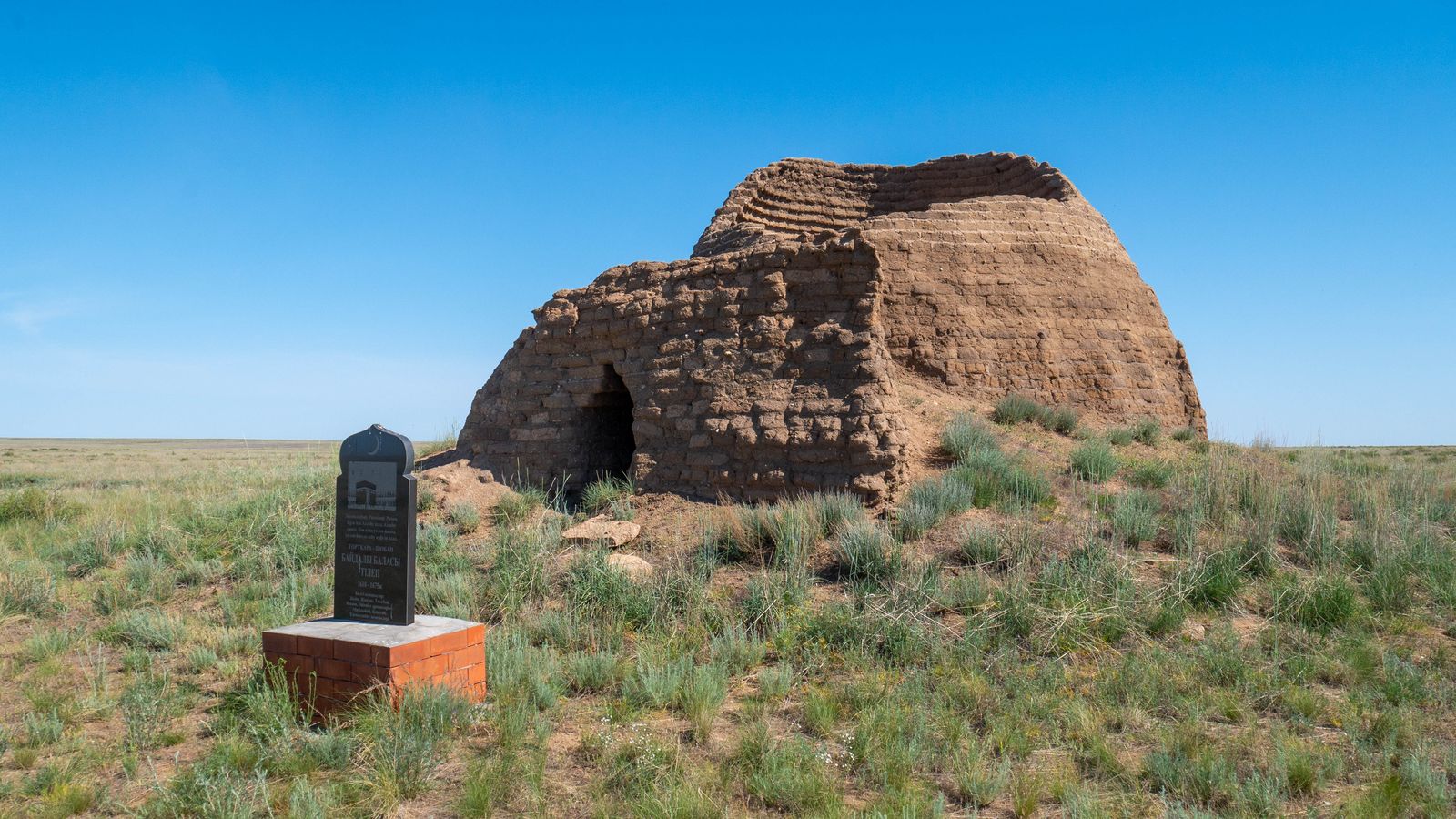 Наш путь постепенно стал удаляться от границы, и через несколько километров мы увидели заметный ориентир здешних мест – Бай-могилу. Про этот памятник глиняного зодчества в виде надмогильного купола-юрты высотой около 4 метров и связанные с ним легенды я рассказывал в одной из своих прошлых статей. Подъезжая к нему, не думал, что с момента последнего посещения его в 2012 году здесь что-то существенно могло измениться. Однако перемены все же обнаружились. Теперь перед Бай-могилой установлен памятник из черного камня, на котором изображена Кааба и написан текст. К сожалению, из текста я смог понять только даты: 1610–1675. Кем и когда установлен памятник, пока неясно, но сделано это недавно, так как в интернете найти снимки этого места с новым черным памятником не удалось. Координаты объекта: 50.575020, 59.740870.