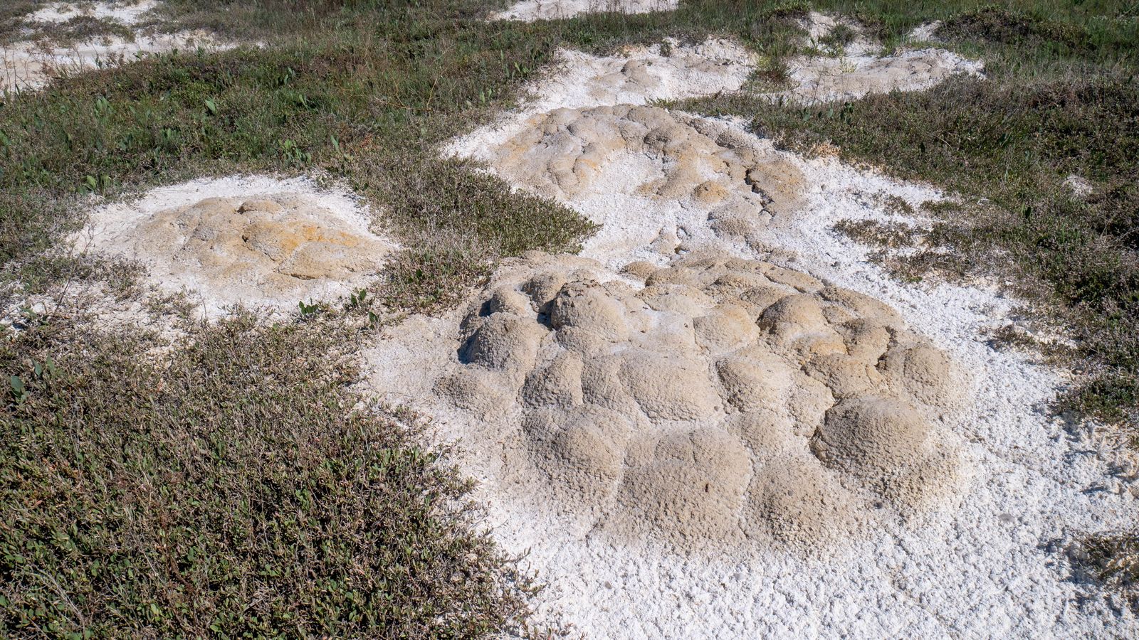 Недалеко от Бай-могилы находится урочище Сазды. Найти его несложно благодаря установленному в 2015 году аншлагу с обозначением этого памятника природы. Примечательно это урочище грязевыми вулканчиками, которые действуют лишь весной, поэтому мало кому удается увидеть их извержение. Вот и мы застали лишь их следы. Сами по себе эти вулканчики невелики, высотой 20-40 сантиметров и шириной до 1,5 метра. Они выделяются на местности белым цветом и характерными следами вспученности. Координаты вулканчиков: 50.573990, 59.736210.