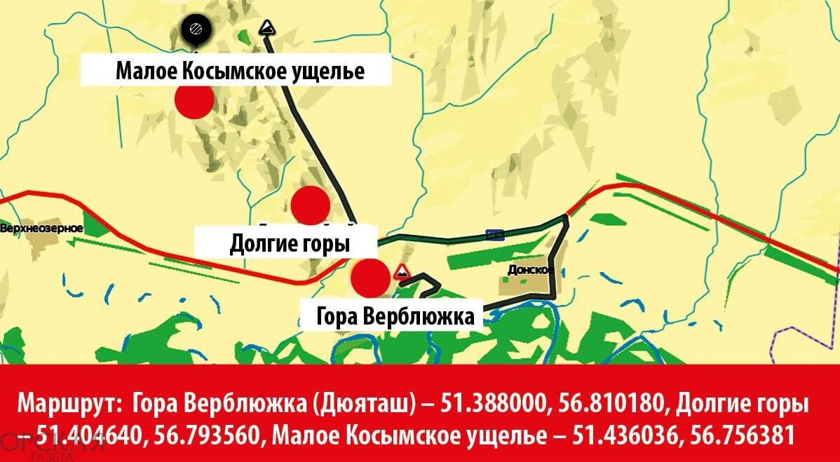 Южной точкой Долгих гор является гора Верблюжка, или Дюяташ. Также встречается ее название с буквой «ж» на конце – Дюятаж. Эту гору отлично видно, когда едешь по оренбургской трассе. При движении в областной центр слева от дороги она будет привлекать к себе внимание двумя вершинами, похожими на горбы верблюда. Отсюда и пошло ее название, хотя в действительности вершин три.