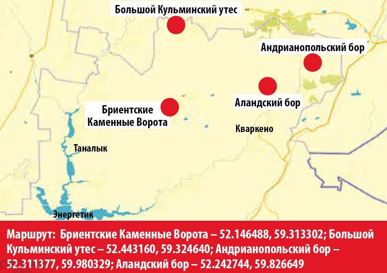 Двигаясь дальше на север, к границе с Челябинской областью, добираемся до села Кульма. Свое название оно получило в честь победы над французами в сражении под Кульмом в августе 1813 года, длившемся 2 дня. Недалеко от села расположен Большой Кульминский утес на реке Малая Караганка. Это скала-останец с размерами по подножию 80 х 40 м и высотой до 10 м. Место тут очень живописное, перед скалой есть широкий плес. Можно удобно расположиться для отдыха. Координаты объекта: 52.443160, 59.324640.