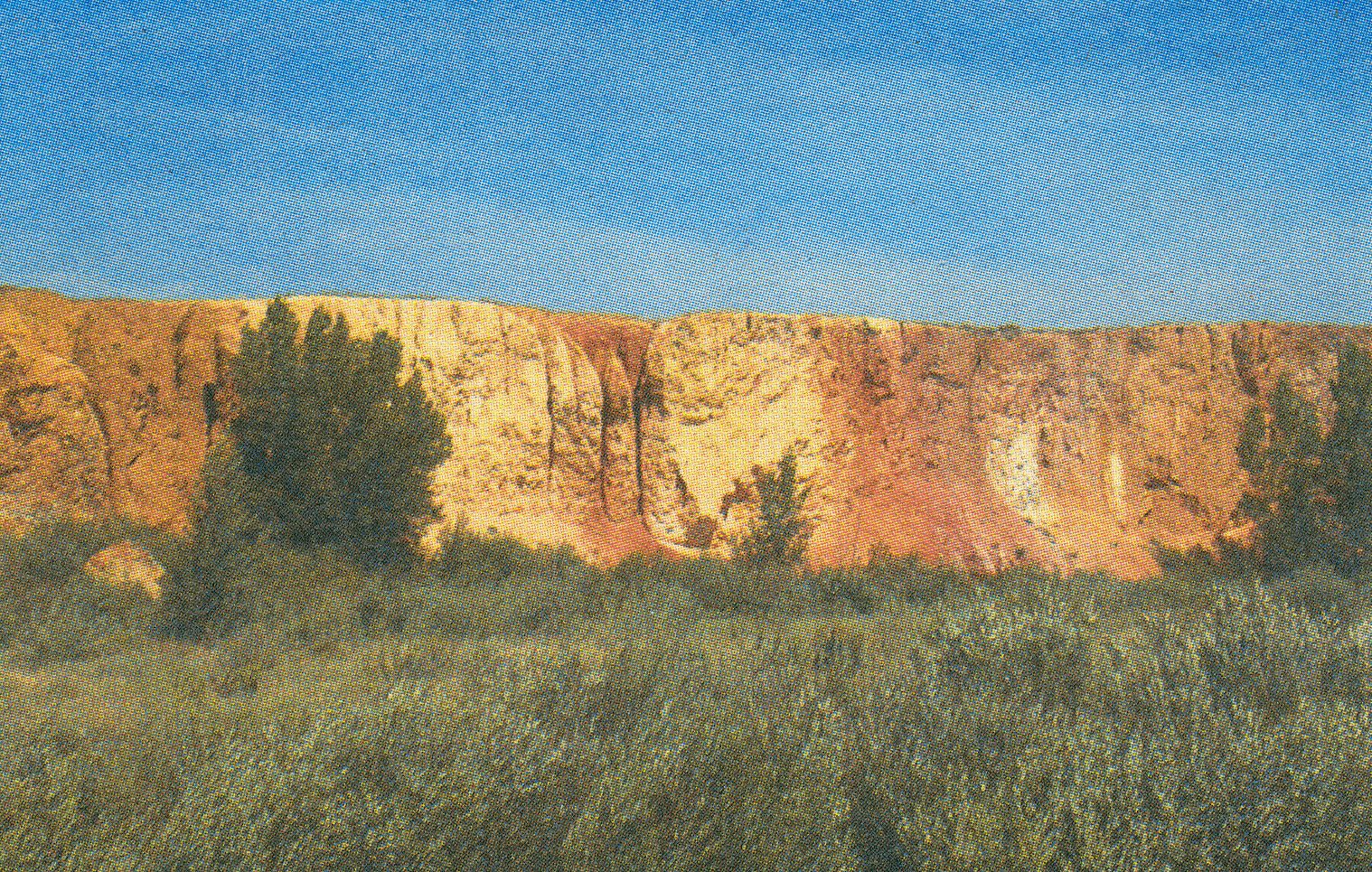 СТЕПЬ. Жара. Поселок с журчащим названием Речной. Буквально через 3,5 км по правобережью реки Жаман-Акжар находится восхитительный по своей красоте разрез древних рыхлых отложений, который местные жители называют — Семицветник. Вокруг желтая степь, усеянная сочным зеленым кустарником, над которым возвышается красочная каменная радуга. Он возник с изумительной многокрасочностью глин, которые образовались еще задолго до того, как появились люди и вымерли динозавры — 70 миллионов лет назад. В то время климат в этих широтах был от субтропического до тропического. Жара и обилие влаги вызвали бурное течение природных химических реакций. В результате от мезозойской эры на Южном Урале остались не только пестроцветные глины, но и скопление самих минеральных красок, в основном охры. Цветов наберется, пожалуй, больше семи: красный, розово-белый, белый, вишневый, малиновый, сиреневый, коричневый, зеленовато-серый, охристый.
