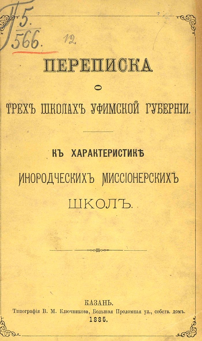 Переписка о миссионерских школах Уфимской губернии: Кадряковской, Усинской и Юмашевской печатается с разрешения Высокопреосвященнейшаго Председателя Православнаго Миссионерскаго Общества, Иоанникия Митрополита Московскаго и Коломенскаго, изложеннаго в предложении Его Высокопреосвященства от 17 Марта 1885 года за № 68. Притом, Преосвященнейший Дионисий, Епископ Уфимский и Мензелинский, преподал разрешение и благословение к напечатанию сведений, касающихся миссионерских школ и крещеных инородцев Уфимской епархии, в письме от 25 Февраля 1885 г.— Преосвященнейший Амвросий, Епископ Харьковский и Ахтырский, изъявил согласие на напечатание его писем относительно упомянутых школ, в письме от 25 Января 1885 года.— Переписка, касающаяся Усинской школы, печатается с ведома Г. Председателя Белебейскаго Училищнаго Совета, Предводителя Дворянства, Ивана Михайловича Бунина.