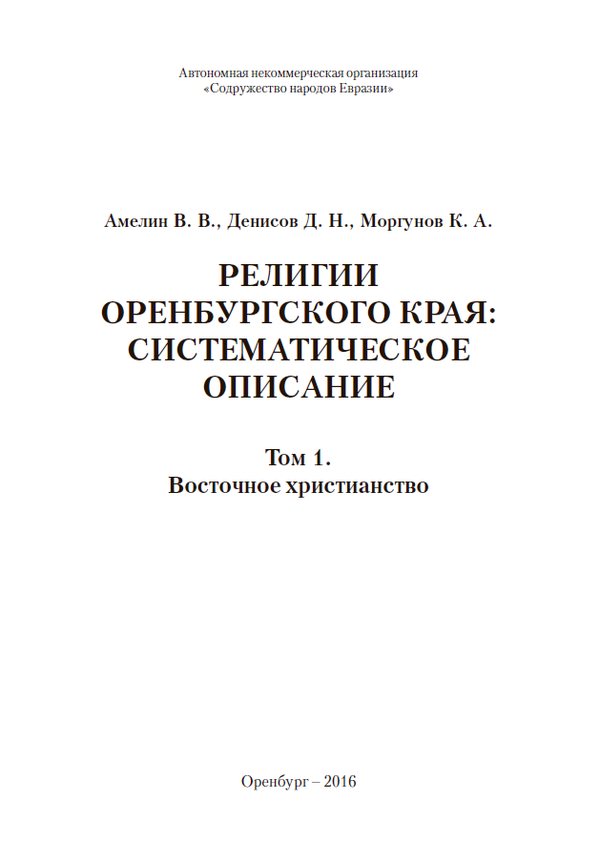 В фундаментальном справочнике на широком круге архивных и других источников раскрывается история и современное положение в Оренбургском крае его конфессий и религиозных объединений. Первый том посвящён восточному христианству: православию, старообрядчеству, духовному христианству, Армянской Апостольской Церкви. Издание адресовано учёным, специалистам в области государственного и муниципального управления, а также всем интересующимся религиозной жизнью народов Южного Урала.