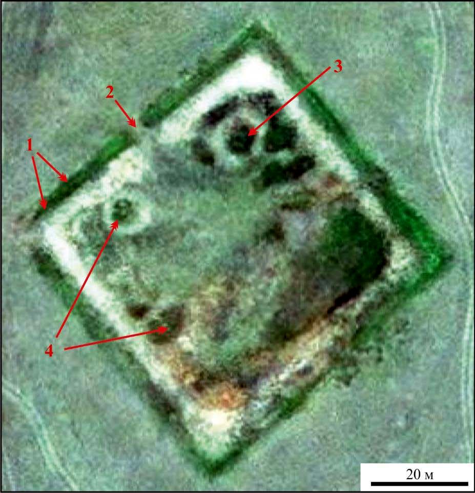 1 – валы и рвы; 2 – вход в форпост; 3 – яма на месте колодца; 4 – ямы на месте жилищ-полуземлянок