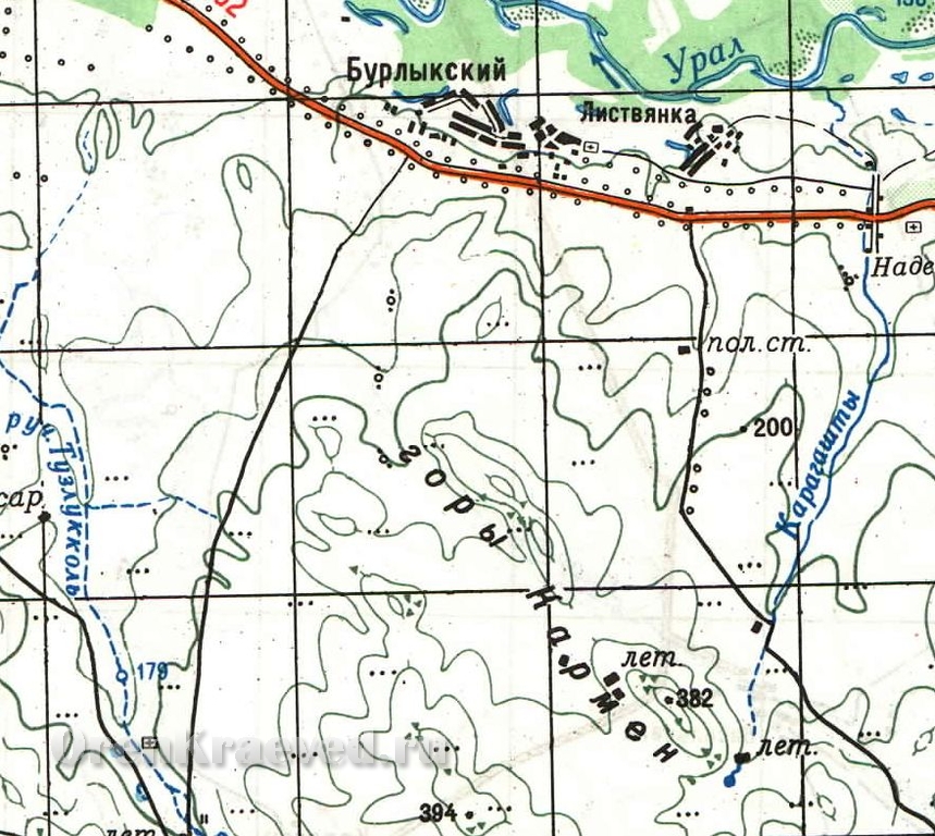 В 10 км к ЮЮВ от посёлка Бурлыкского.