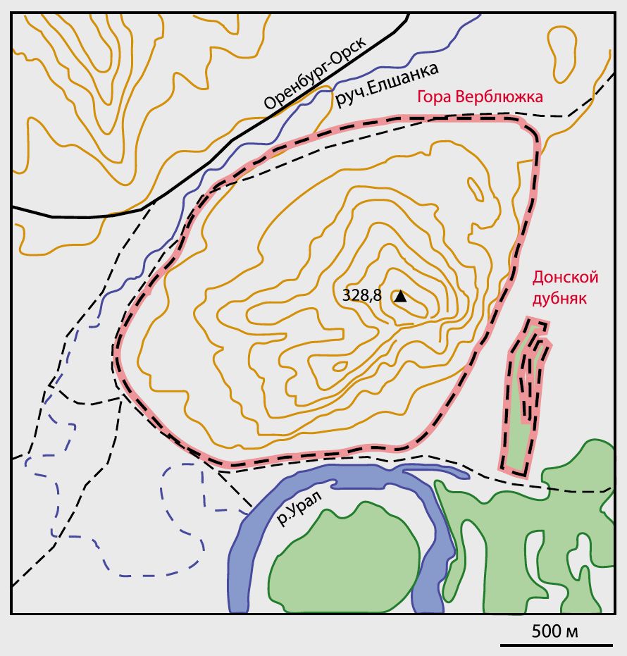 Очень заметным ландшафтным ориентиром, обозначающим начало зоны передовых складок Урала, является гора Верблюжка (Дюяташ) с высшей отметкой 329,4 м. Она представляет собой трехглавый холм-останец, возвышающийся над урезом Урала на 198 м. Со стороны гора выглядит "двугорбой", за что и получила свое название "Верблюжка". Происхождение ее связано с повышенной устойчивостью слагающих ее пород и эрозионной деятельностью Урала и впадающей в него Елшанки. Эти реки перепилили поперек в двух местах антиклинальную складку-гряду, вытянутую в северо-западном направлении к селу Кандуровка. Склоны гряды бронированы пластами известняков курмаинской свиты ассельского яруса перми. Эти слои хорошо обнажены в южном обрыве над поймой Урала. Известняки часто имеют битуминозный запах, на что обратил внимание еще Э.А. Эверсманн (1840), назвав их "вонючкой". Среди тонких слоев в верхней части обрыва прослеживается один более мощный (до 80 см) слой, состоящий из известняковой брекчии. Подобные брекчии имеют морское происхождение и образуются благодаря придонным мутьевым потокам.